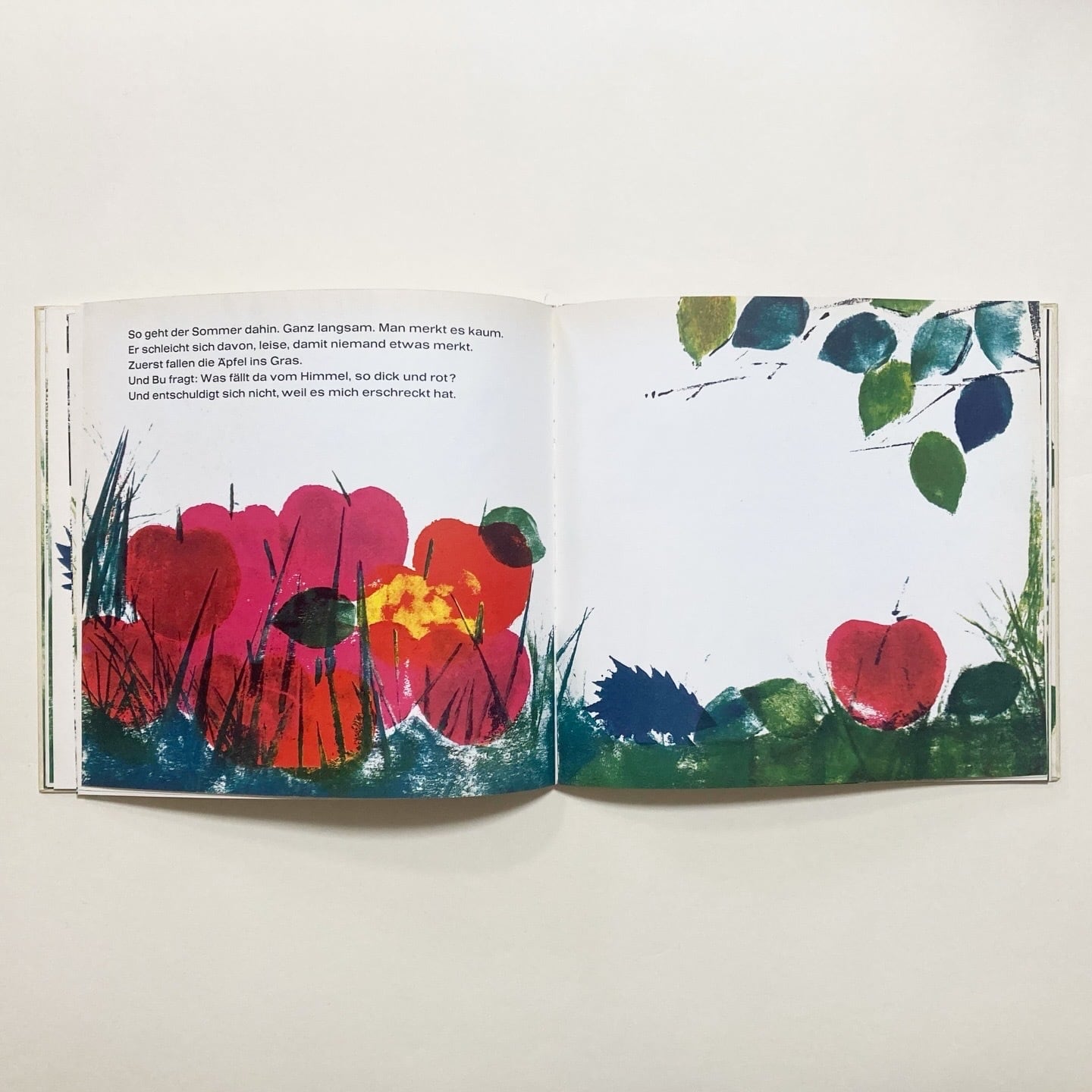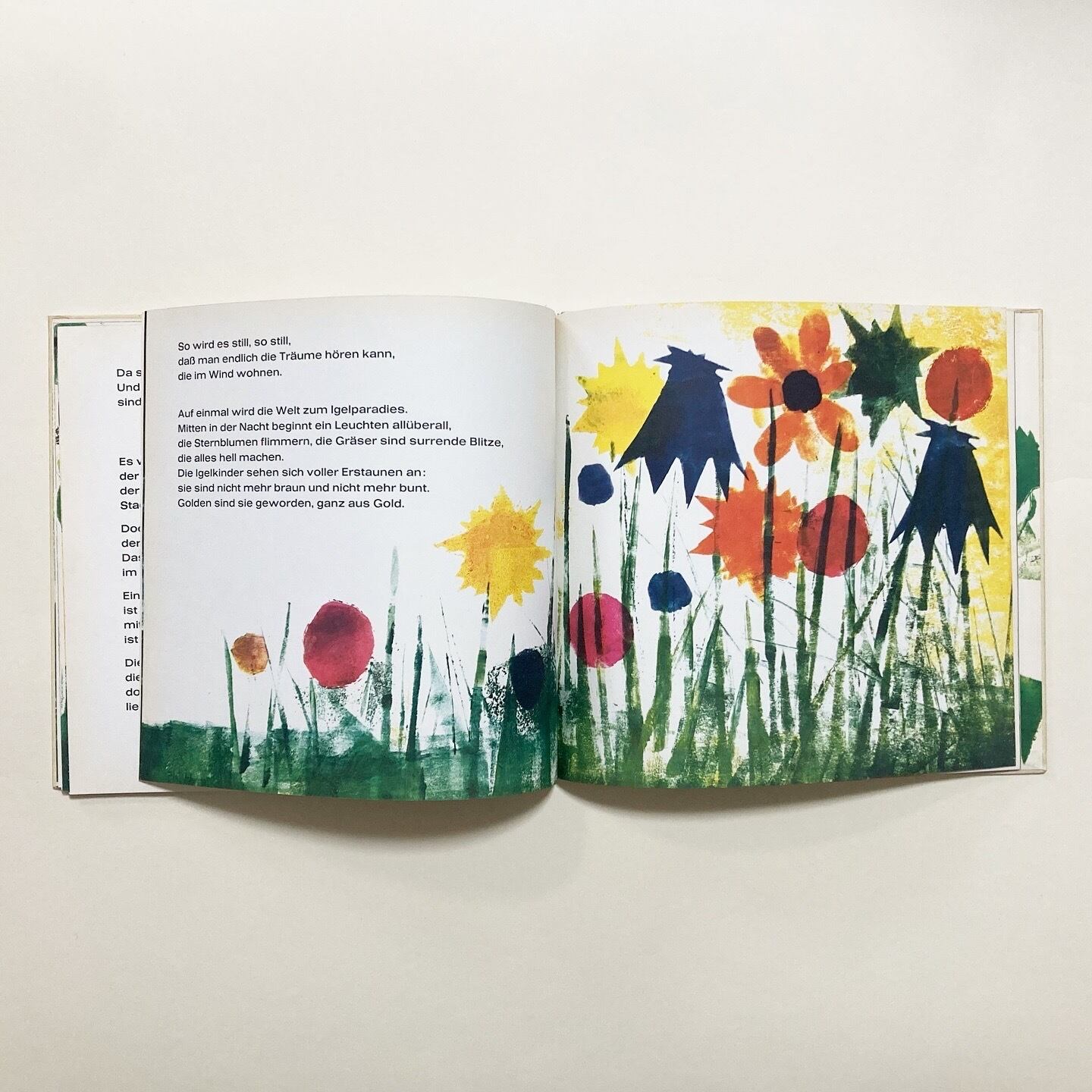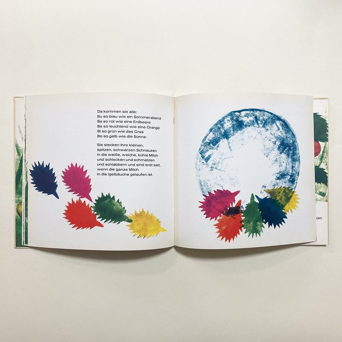 主人公は、はりねずみの子どもたち。はりねずみの親子の日常の様子を描いています。音の響きを大切にした構成の絵本です。挿絵は Dietlind Blech が担当。色鮮やかなイラストと、インクのかすれや色の重なりが美しい一冊です。