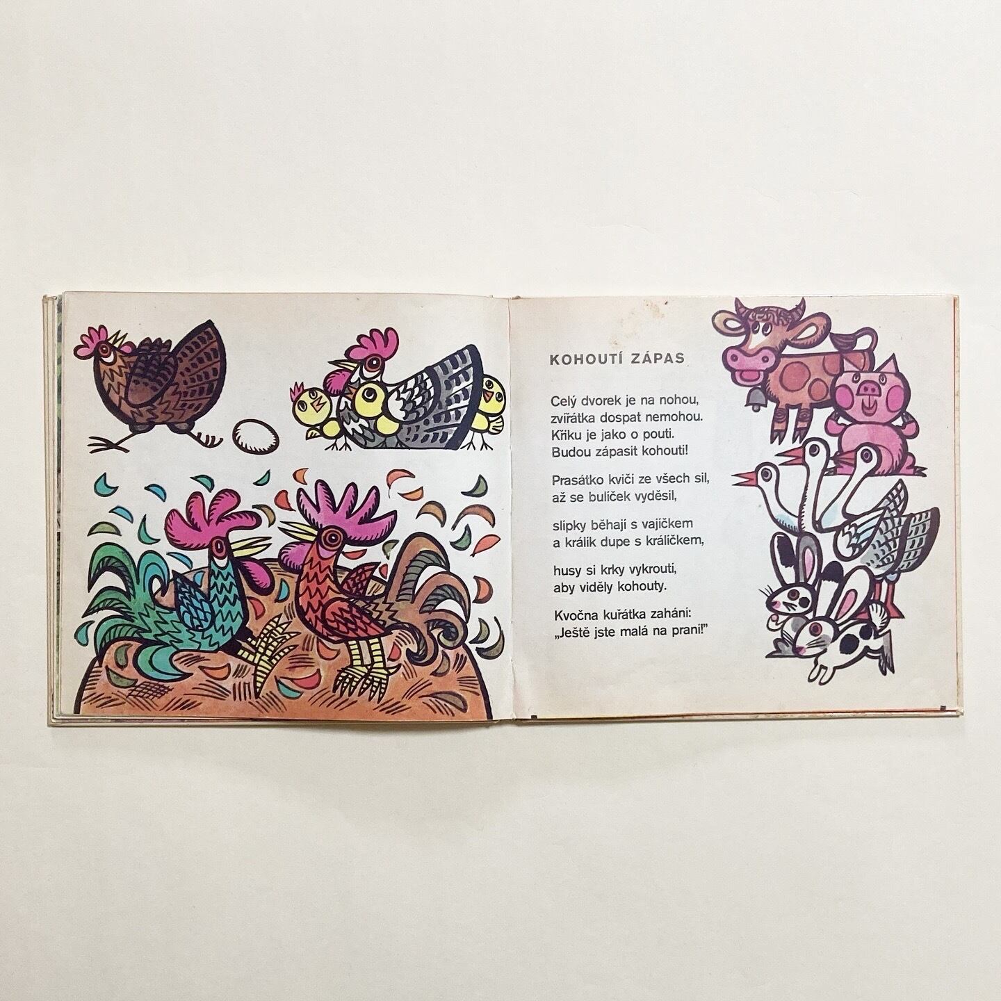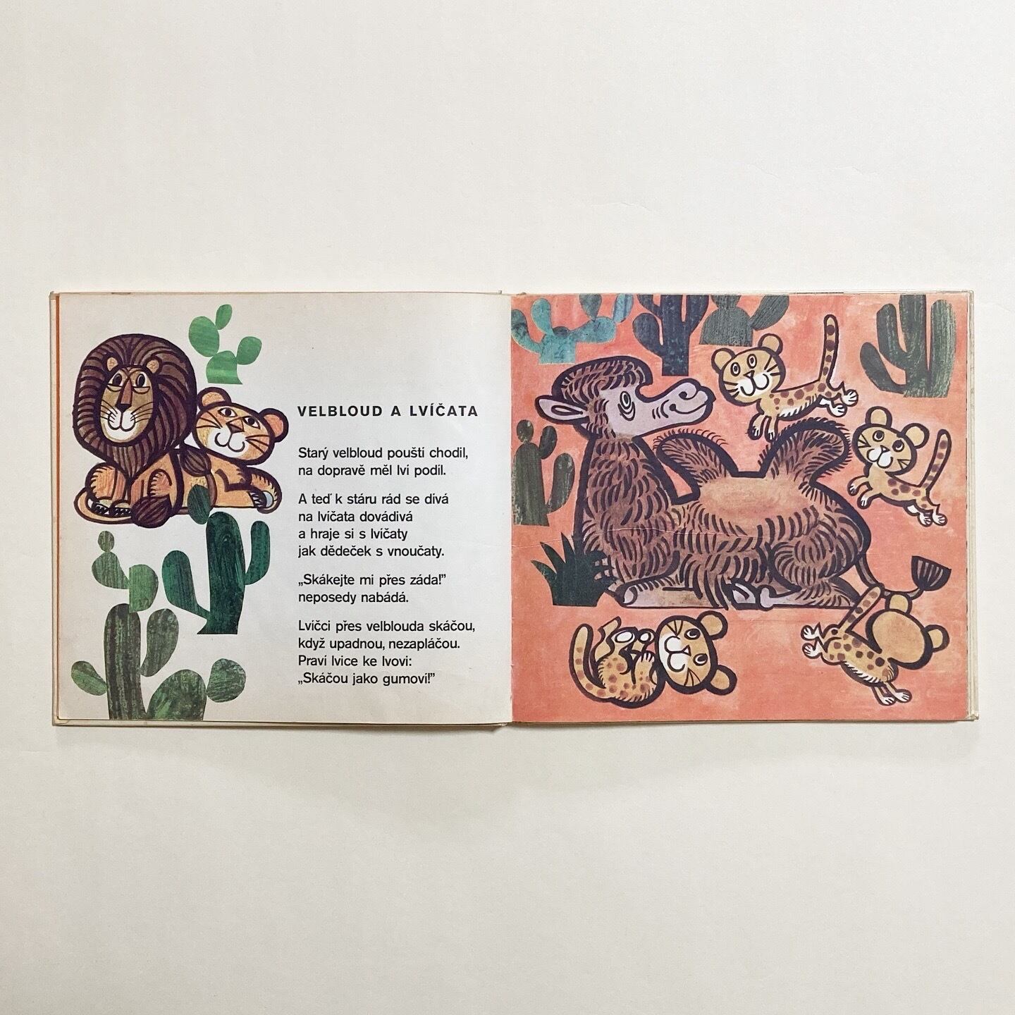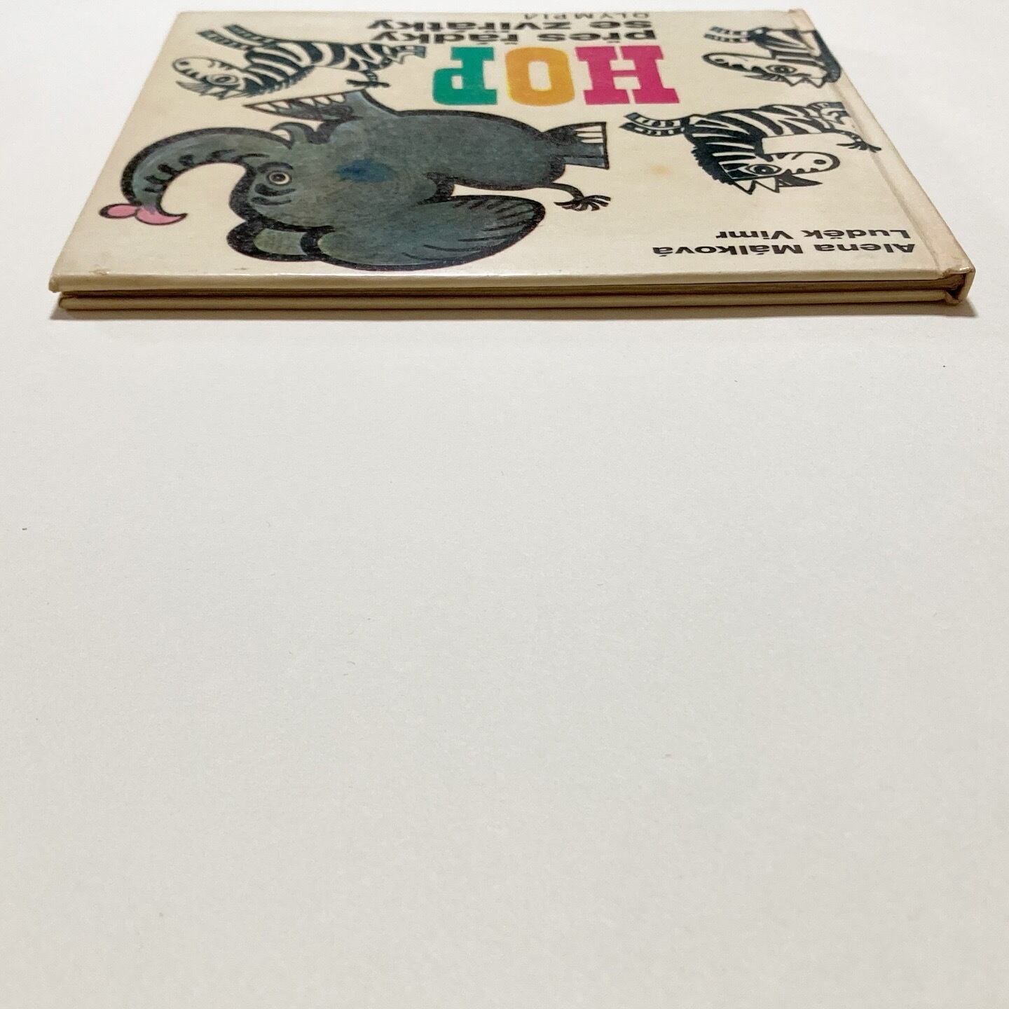 ぞう・しまうま・かえる・ダチョウ・カンガルーなど、さまざまな動物たちがユーモラスに描かれた絵本です。リズミカルな短いお話が添えられています。イラストは、チェコのイラストレーター Ludek Vimr (ルヂェク・ヴィムル)が担当。ページの細部にいくつかコラージュを用いたり、めくるたびに楽しい気持ちになれる一冊です。
