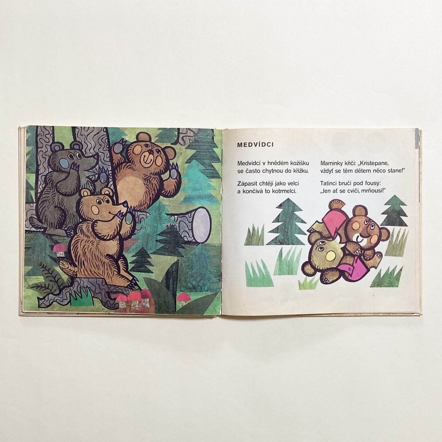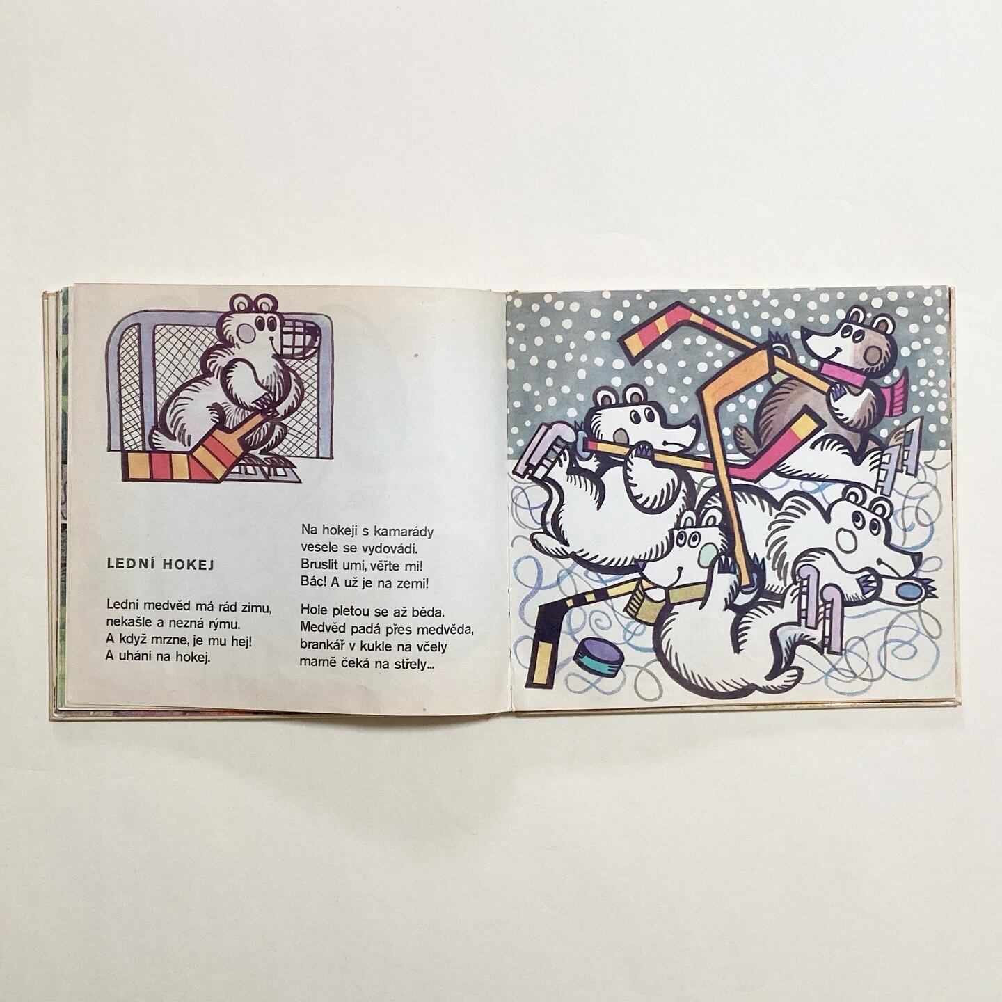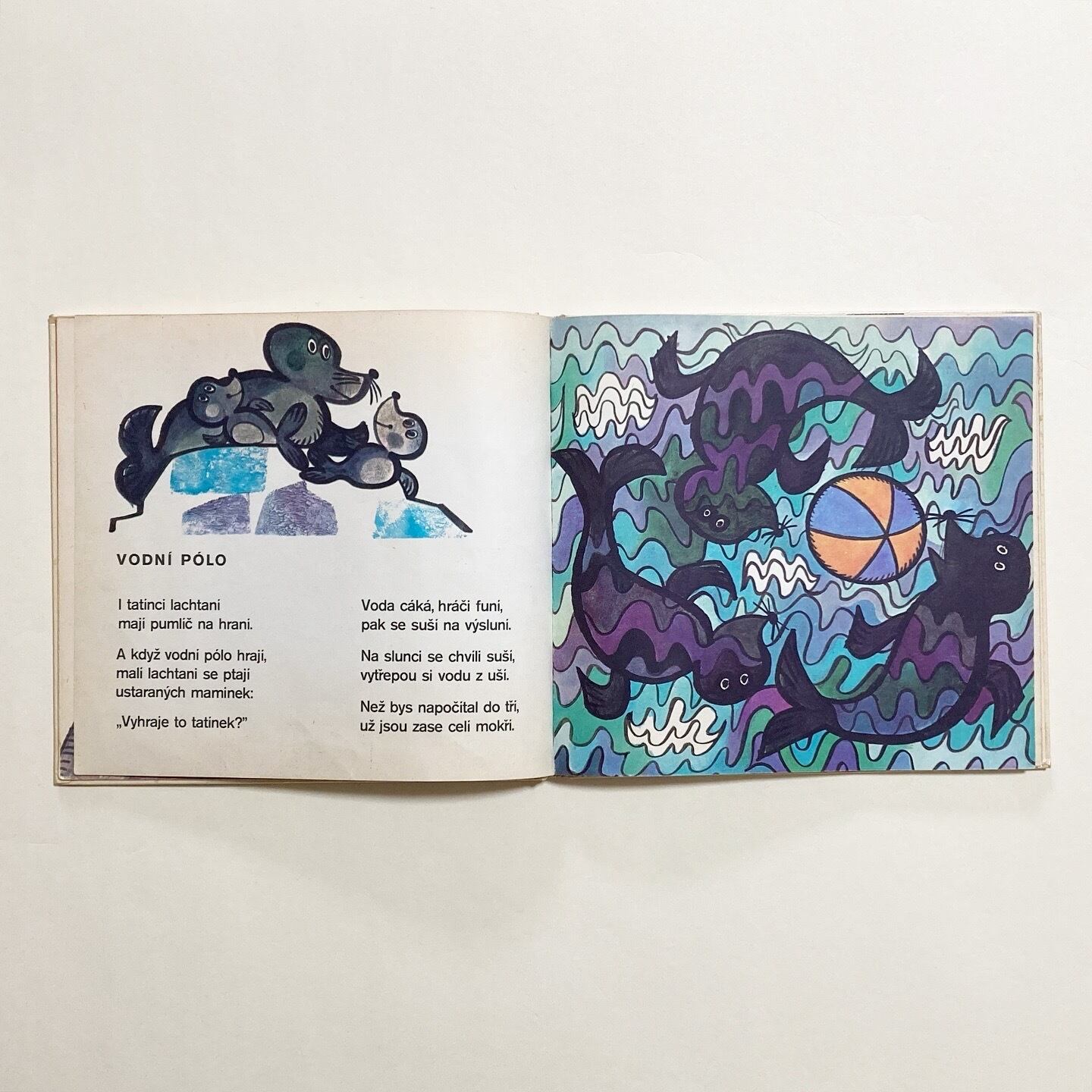 ぞう・しまうま・かえる・ダチョウ・カンガルーなど、さまざまな動物たちがユーモラスに描かれた絵本です。リズミカルな短いお話が添えられています。イラストは、チェコのイラストレーター Ludek Vimr (ルヂェク・ヴィムル)が担当。ページの細部にいくつかコラージュを用いたり、めくるたびに楽しい気持ちになれる一冊です。