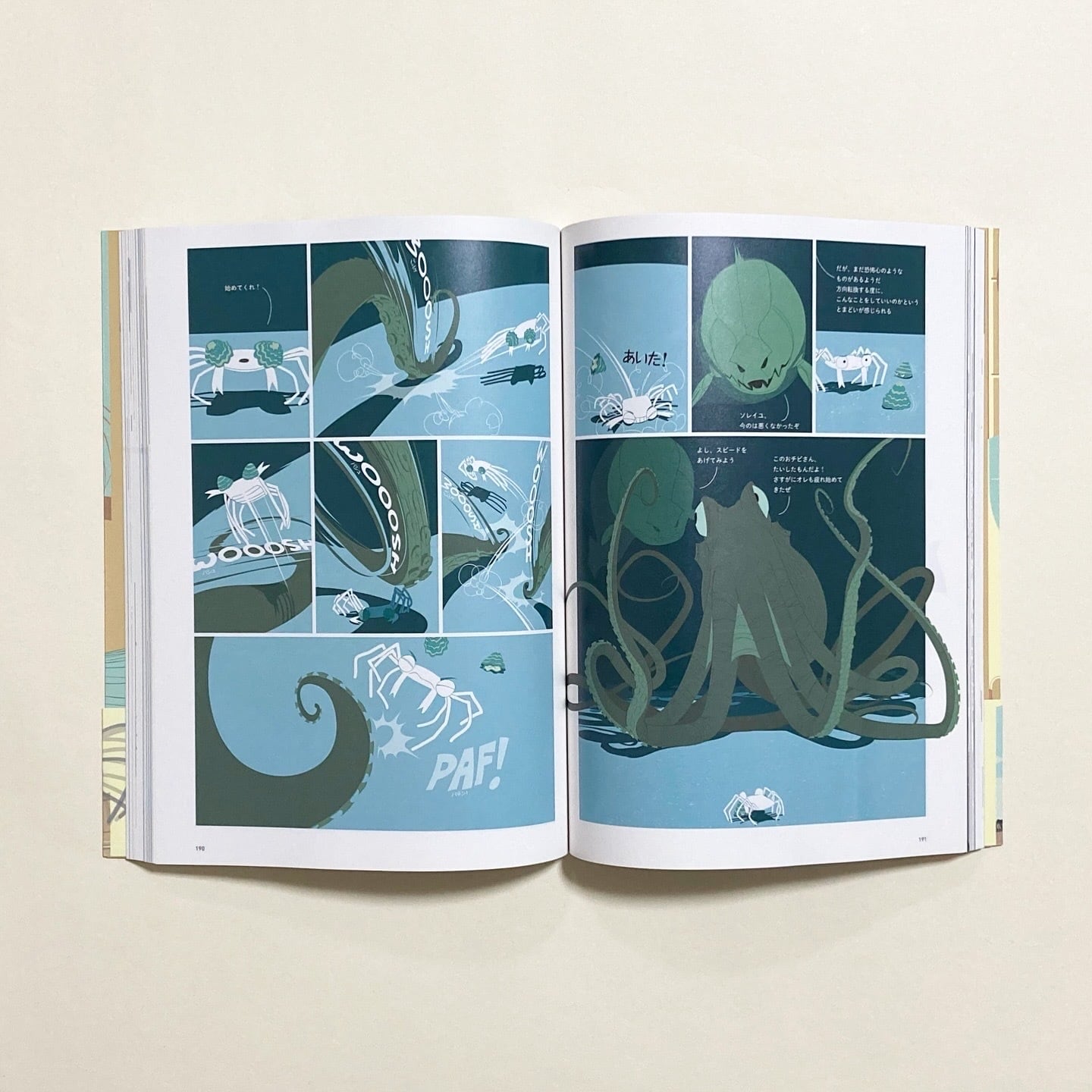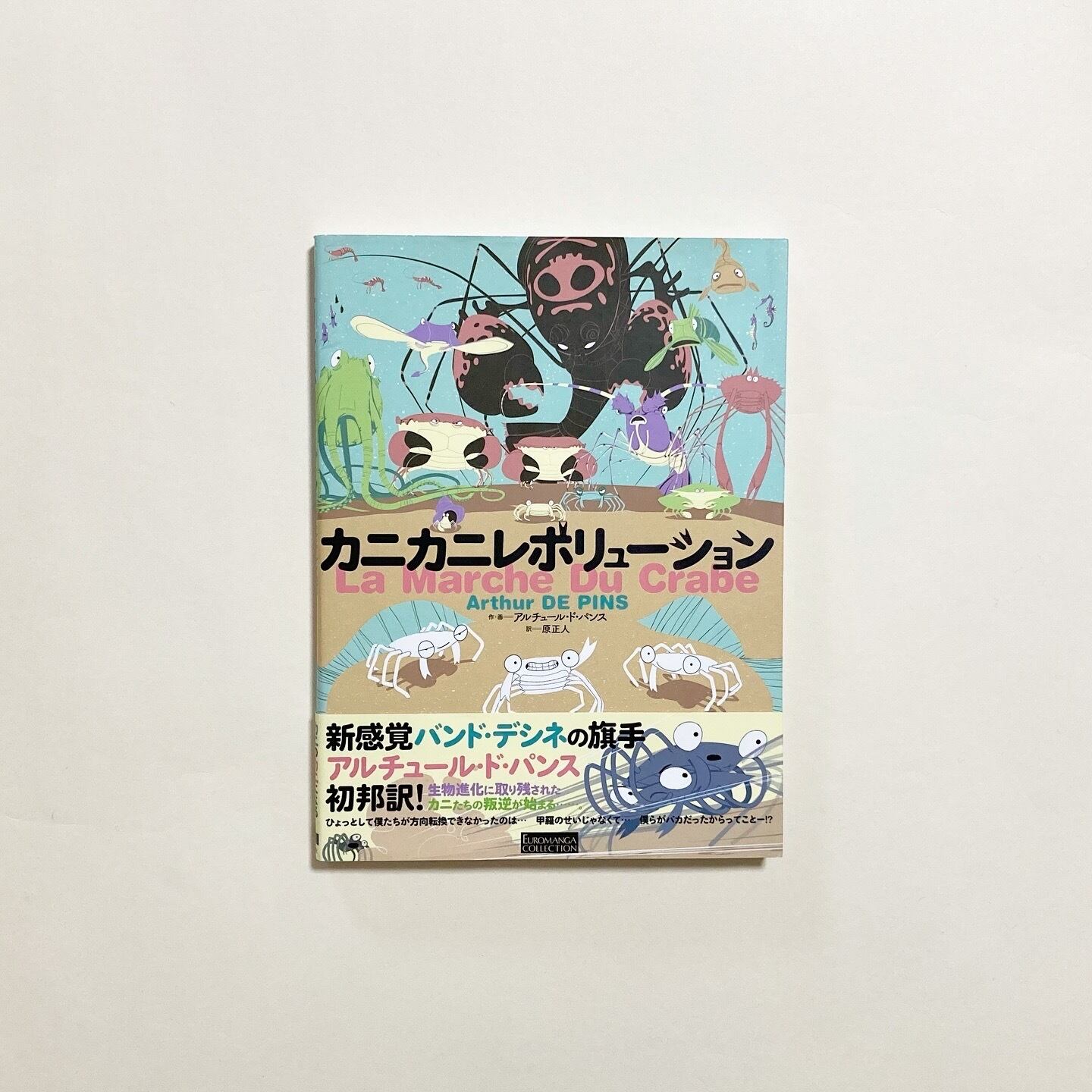 フランス南西部のジロンド川河口に生息するタダノドコニデモイルガニ。別名“四角ガニ”と呼ばれる彼らは、生物進化から取り残され、横にしか移動することができない。しかし、ある日、他の生物たちの嘲笑と迫害に耐えかねたソレイユとバトーとギターの3匹が、革命的な移動方法を思いつく。生物進化から取り残されたカニたちの革命を描く。フランスのBD作家アルチュール・ド・パンス(Arthur de Pins)によるポップでキュートなバンド・デシネです。