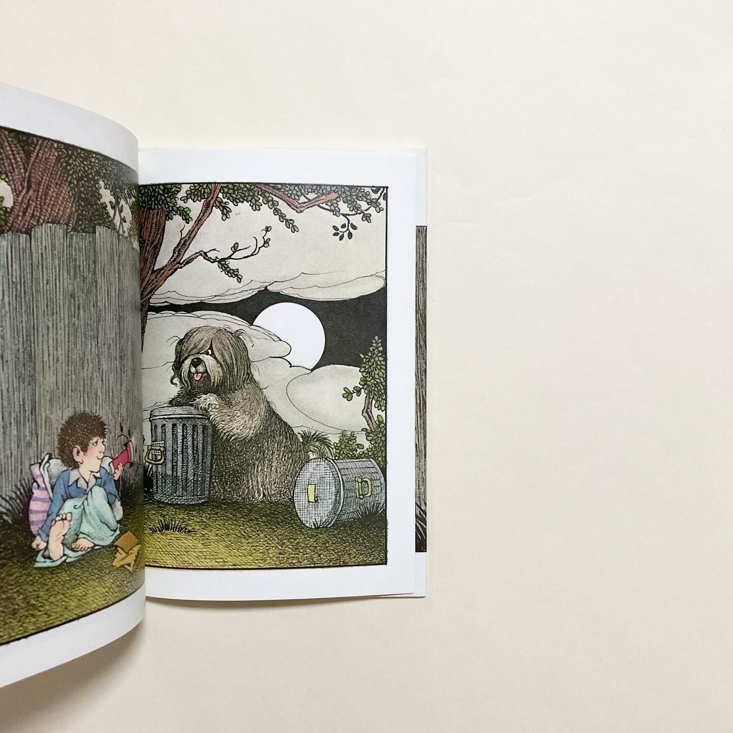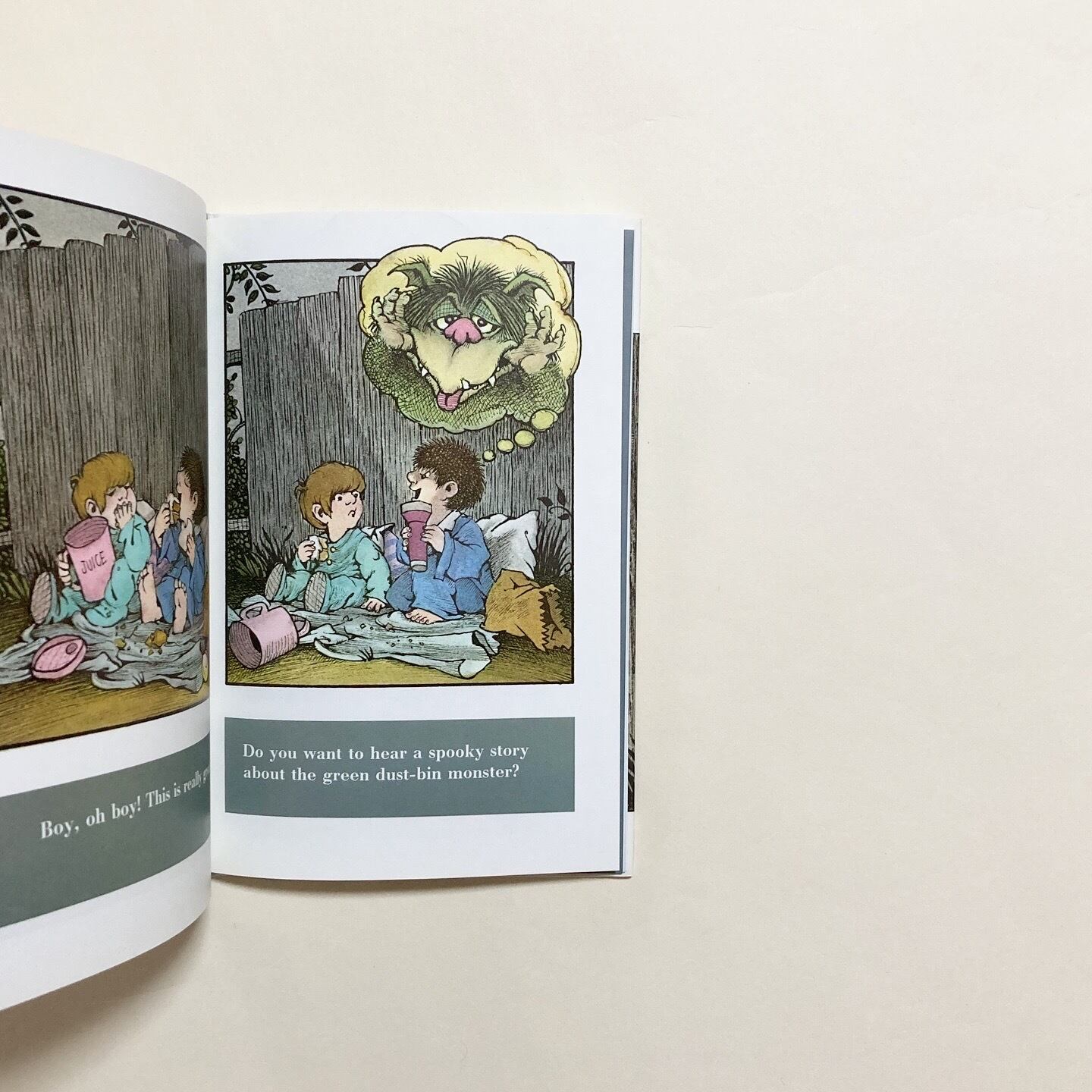 「臆病者じゃないなら、ぼくについてきて!」真夜中、ふたりの兄弟は枕と毛布、懐中電灯とサンドイッチを持って、庭でキャンプをする準備をします。兄が語りはじめるのは、「緑のゴミ箱モンスター」のちょっぴり怖いお話。大きくて醜いそのモンスターは、庭を這い回りながらゴミ箱をあさり、なんでも食べてしまうのだとか……。ちょっぴりこわがりな主人公をユーモラスに描いた一冊です。アメリカのイラストレーター・作家 Mercer Mayer (マーサー・メイヤー)による作品です。