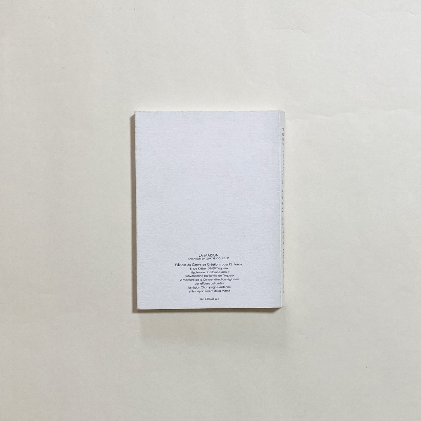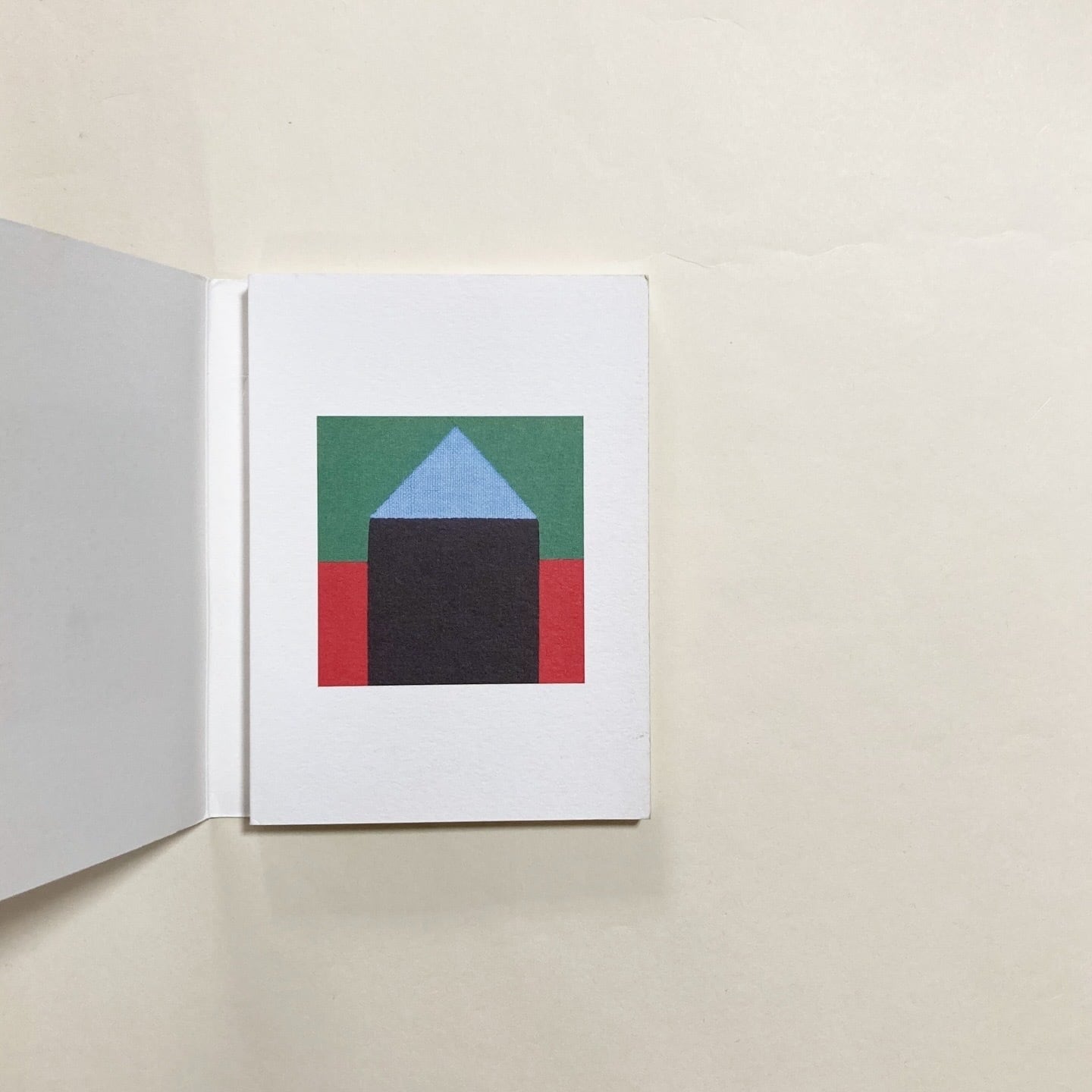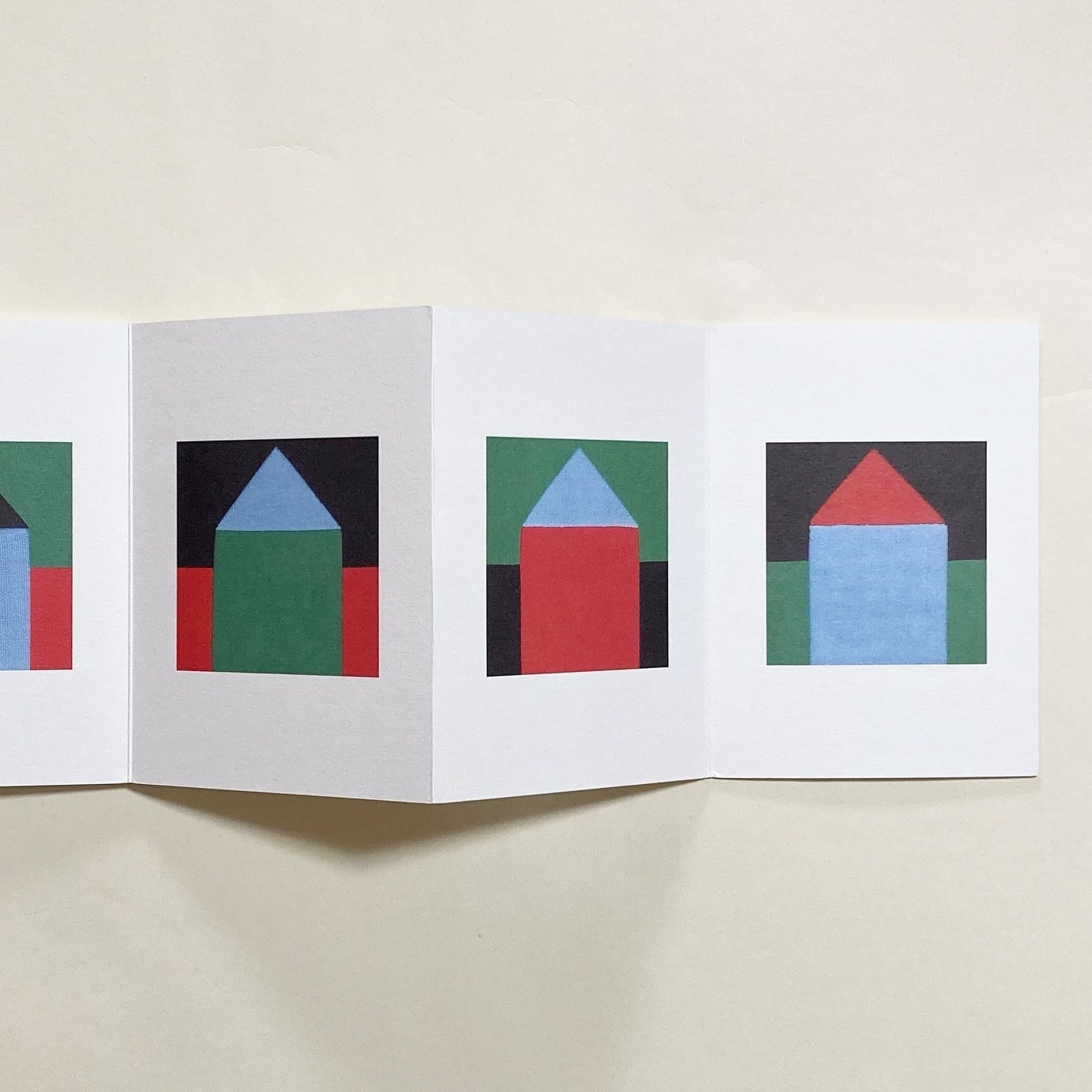 2004年、フランス・ティンクーの子どものための創作センターでの展覧会にあわせて制作されました。4つの色で構成された家が、両面印刷の蛇腹のページの中でゆるやかにつながりながら並んでいきます。やさしい色づかいで、本としてだけでなく、ひとつの小さな風景のように味わえる作品です。